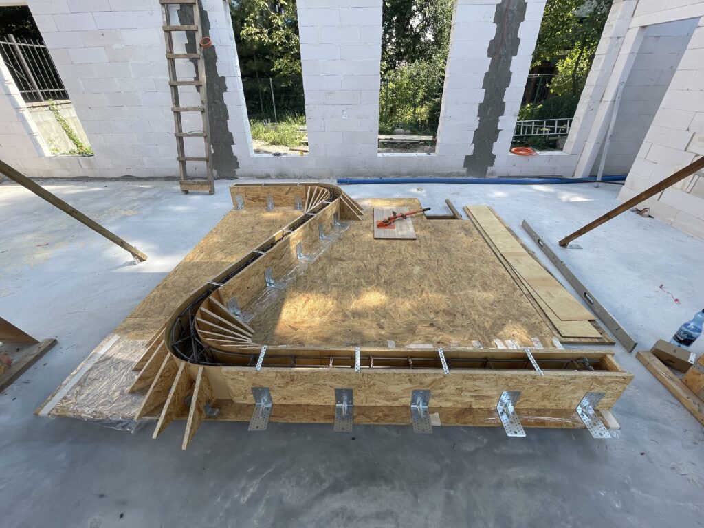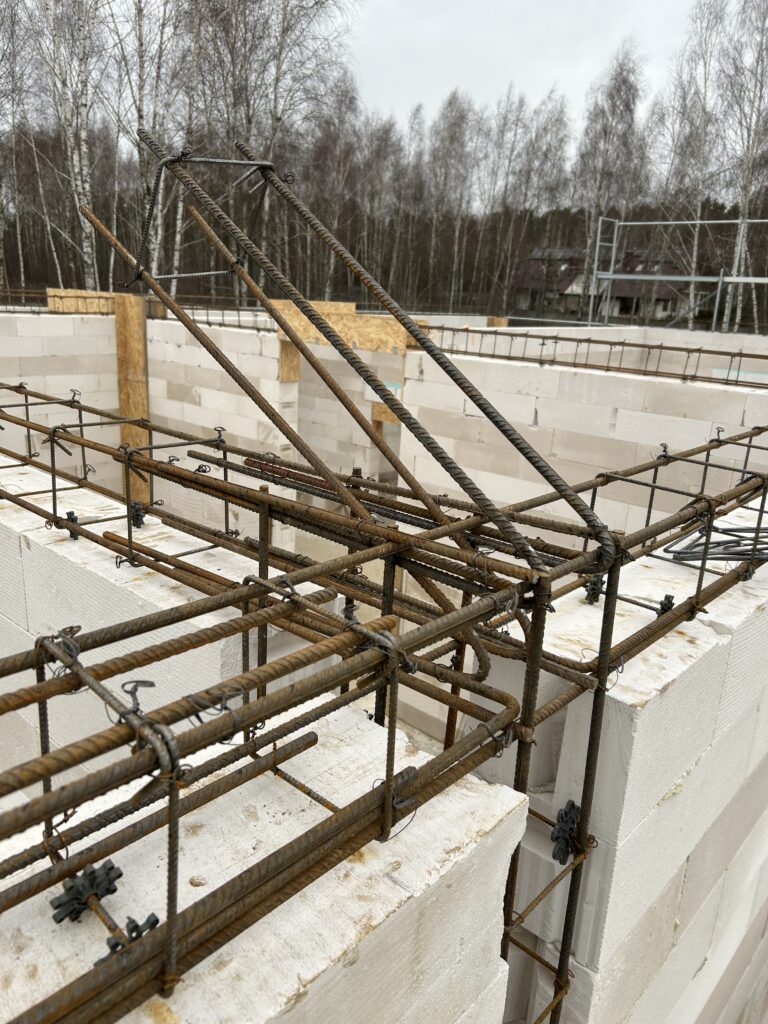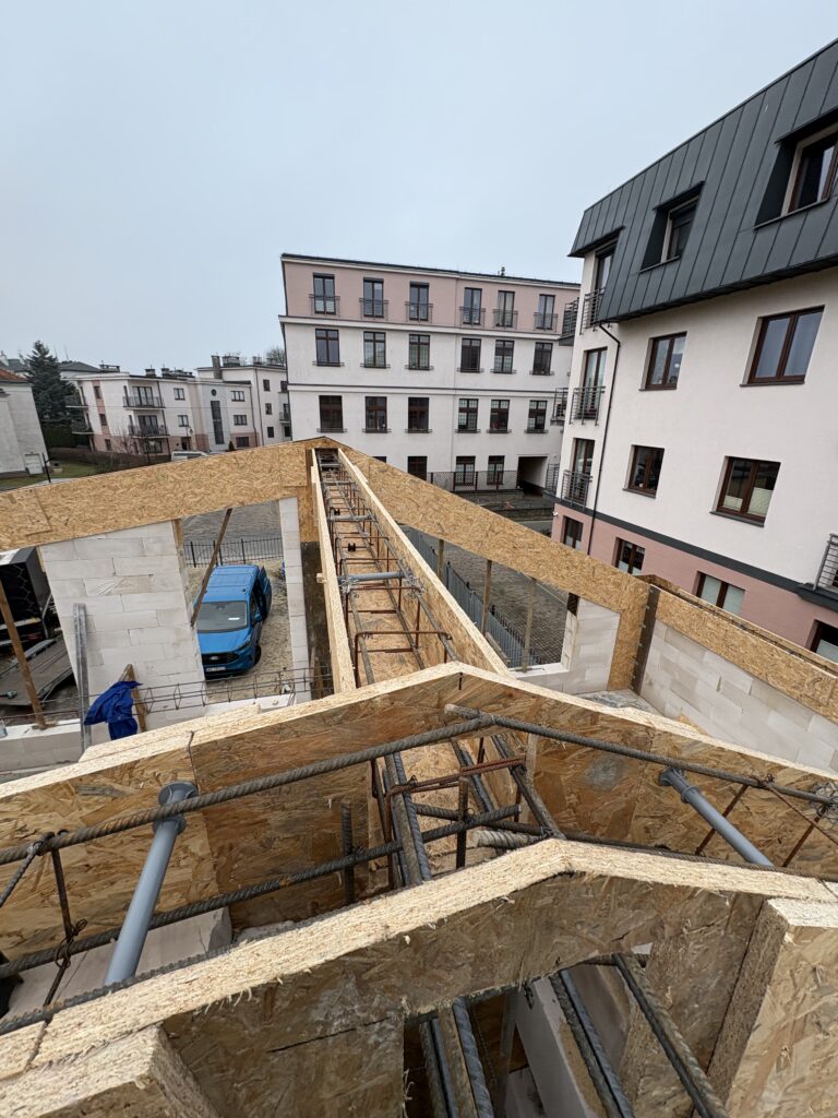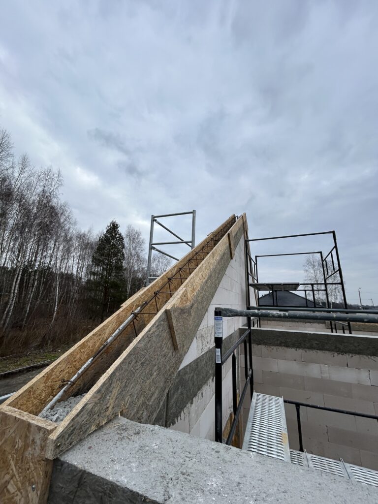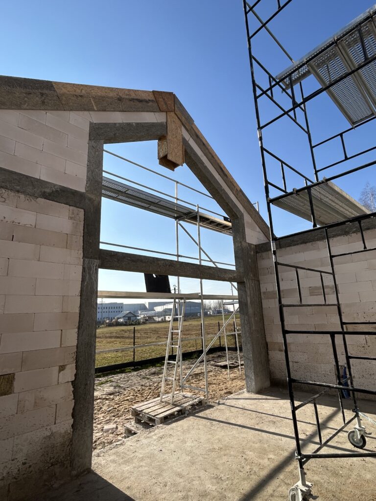 Ławy, płyta, strop, słupy, wieńce w tym skośne, podciągi, murowanie. Stan surowy otwarty 6 m-cy