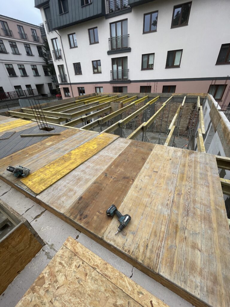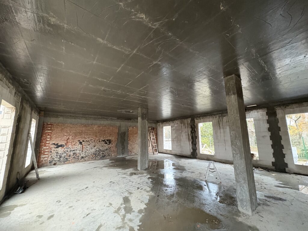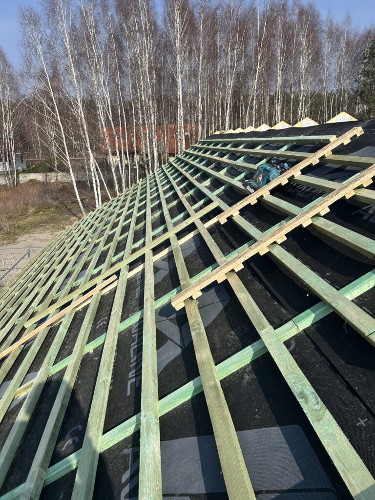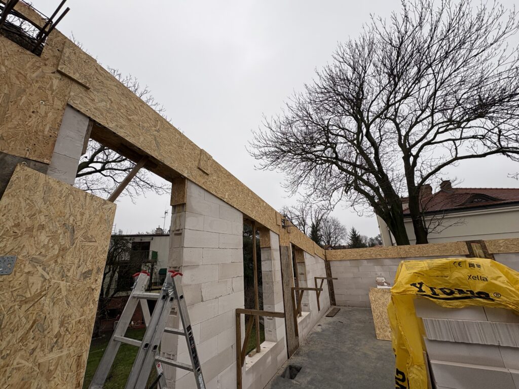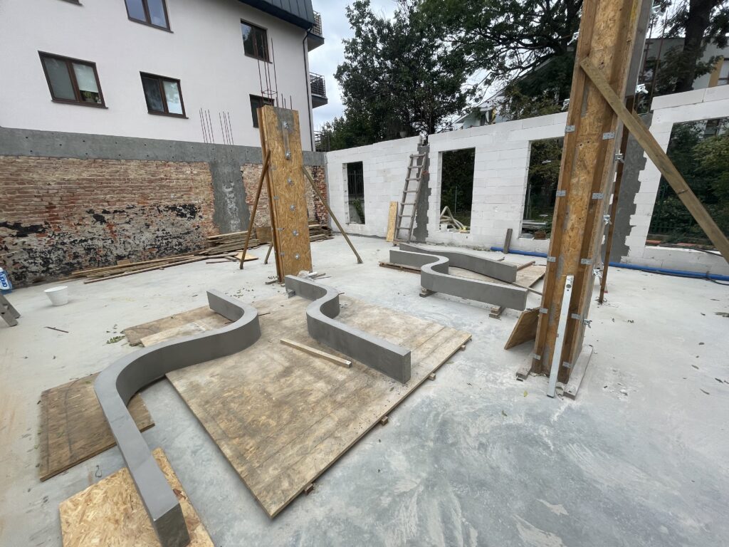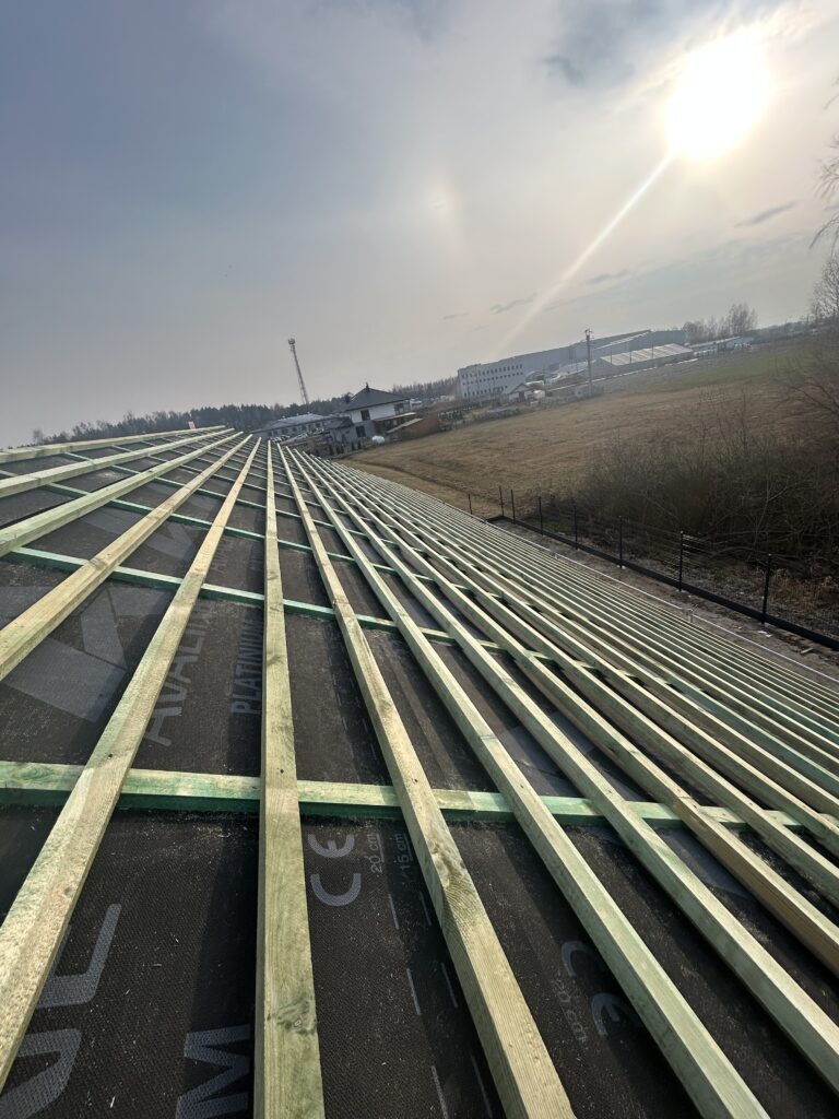 Ławy, płyta, strop, słupy, wieńce w tym skośne, podciągi, murowanie. Stan surowy otwarty 6 m-cy