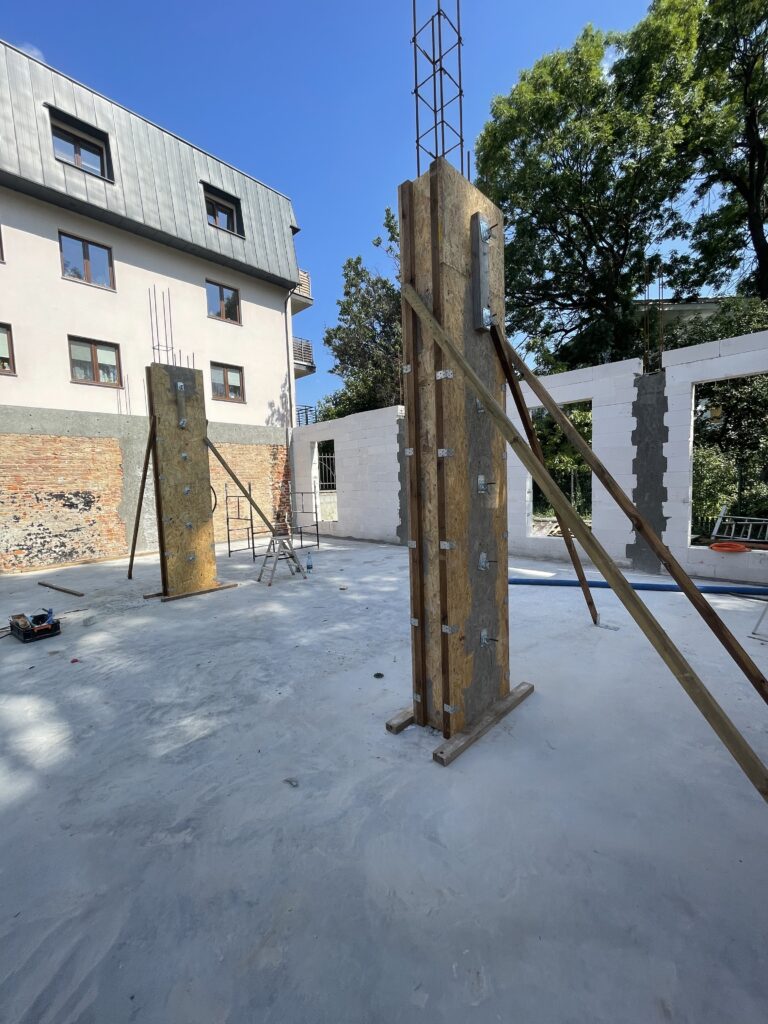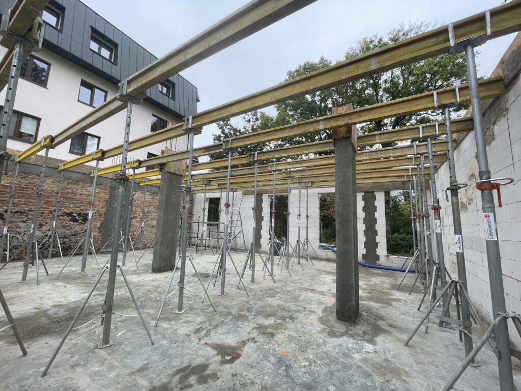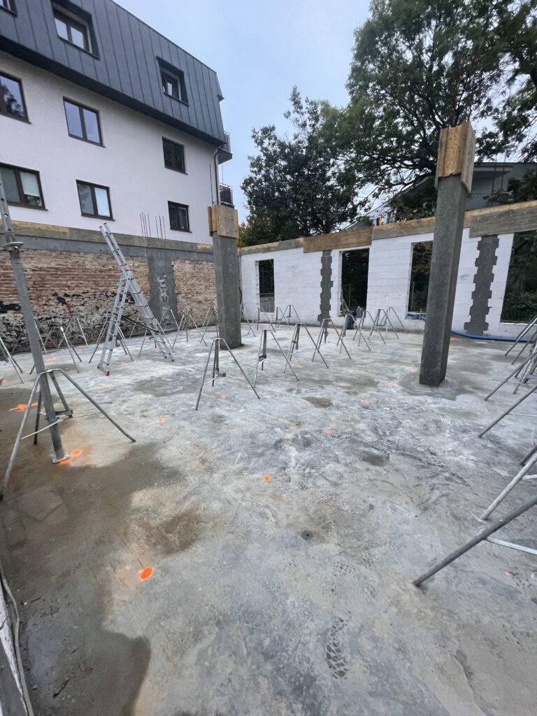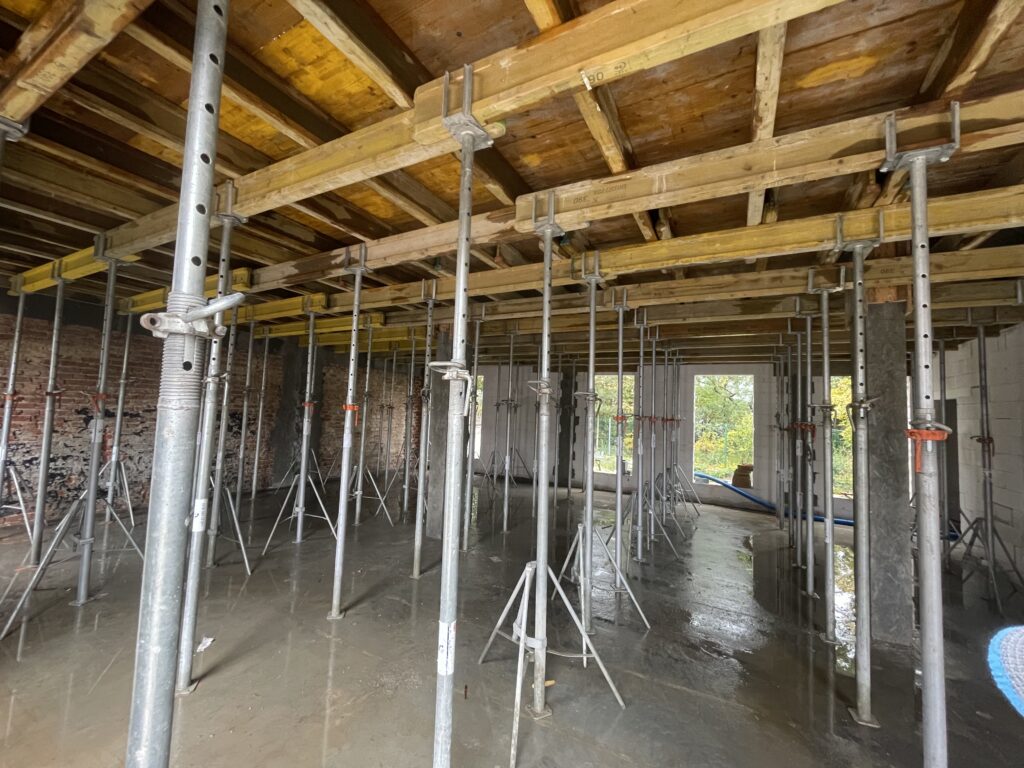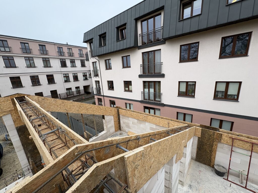 Ławy, płyta, strop, słupy, wieńce w tym skośne, podciągi, murowanie. Stan surowy otwarty 6 m-cy