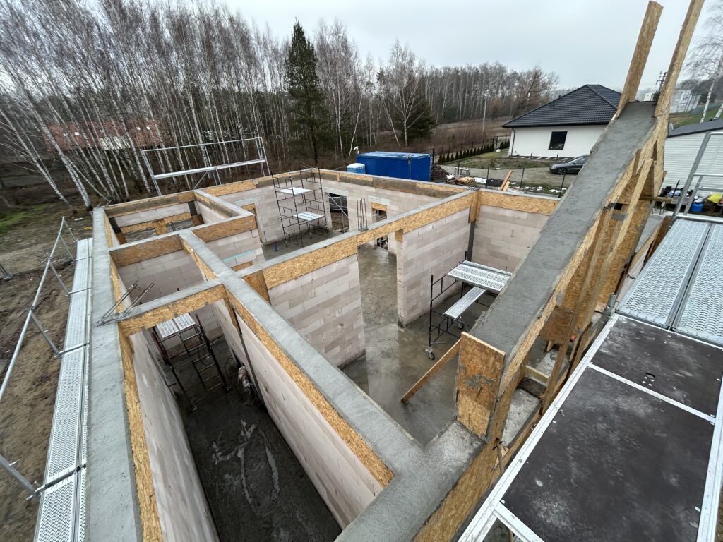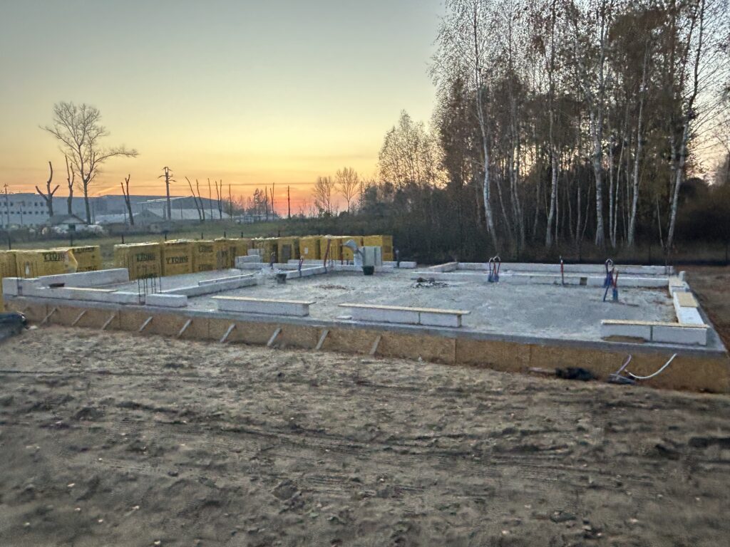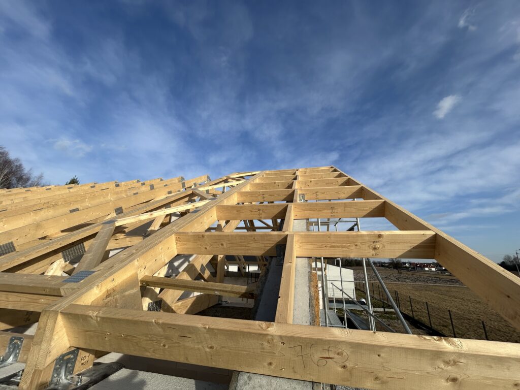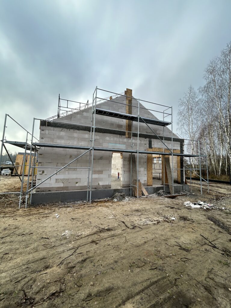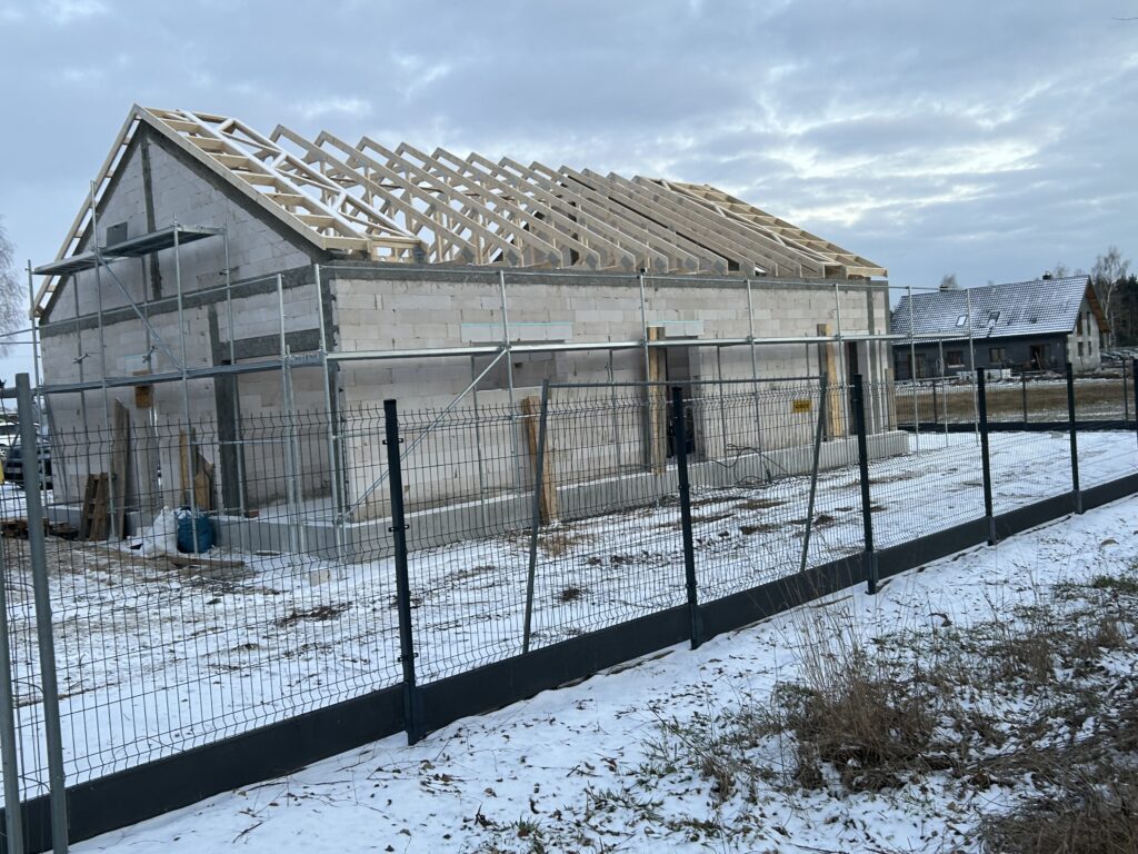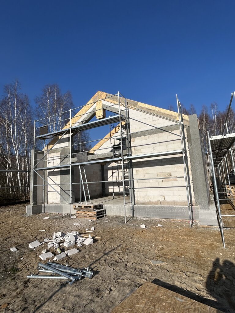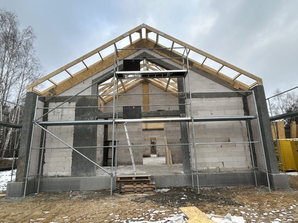 Ciepła płyta fundamentowa, więźba prefabrykowana, realizacja 6 m-cy stan surowy z dachem.
