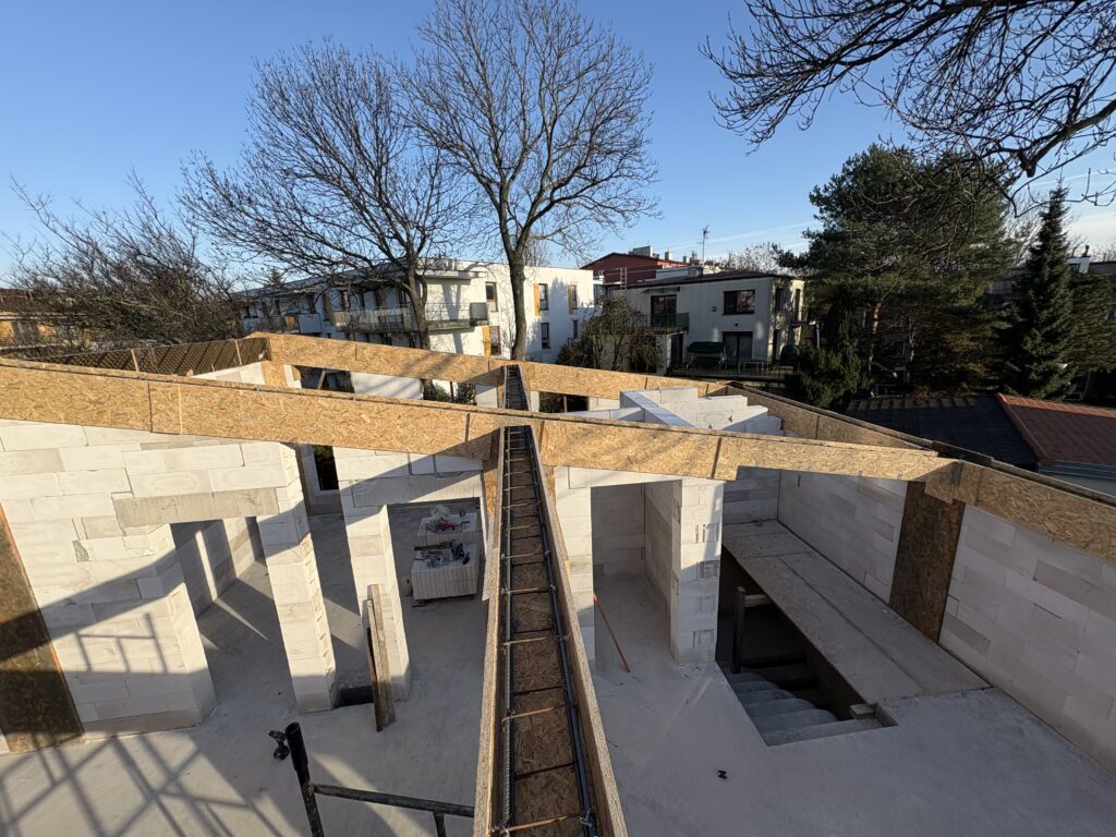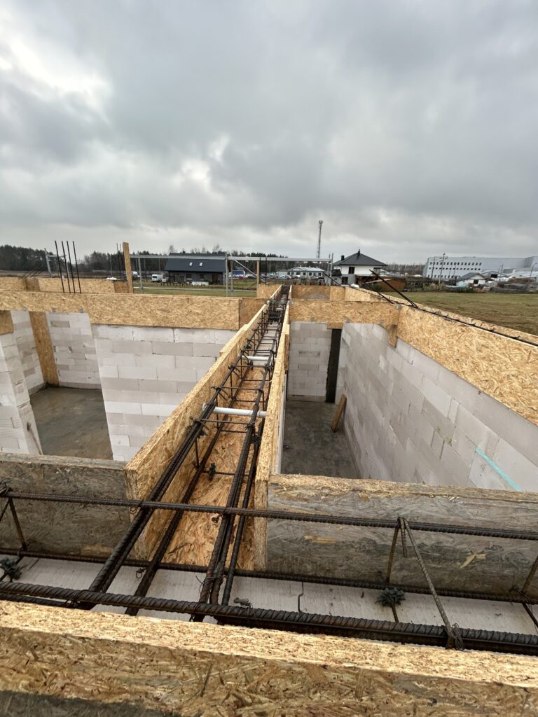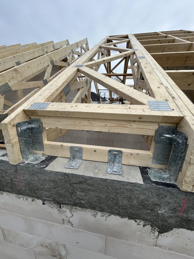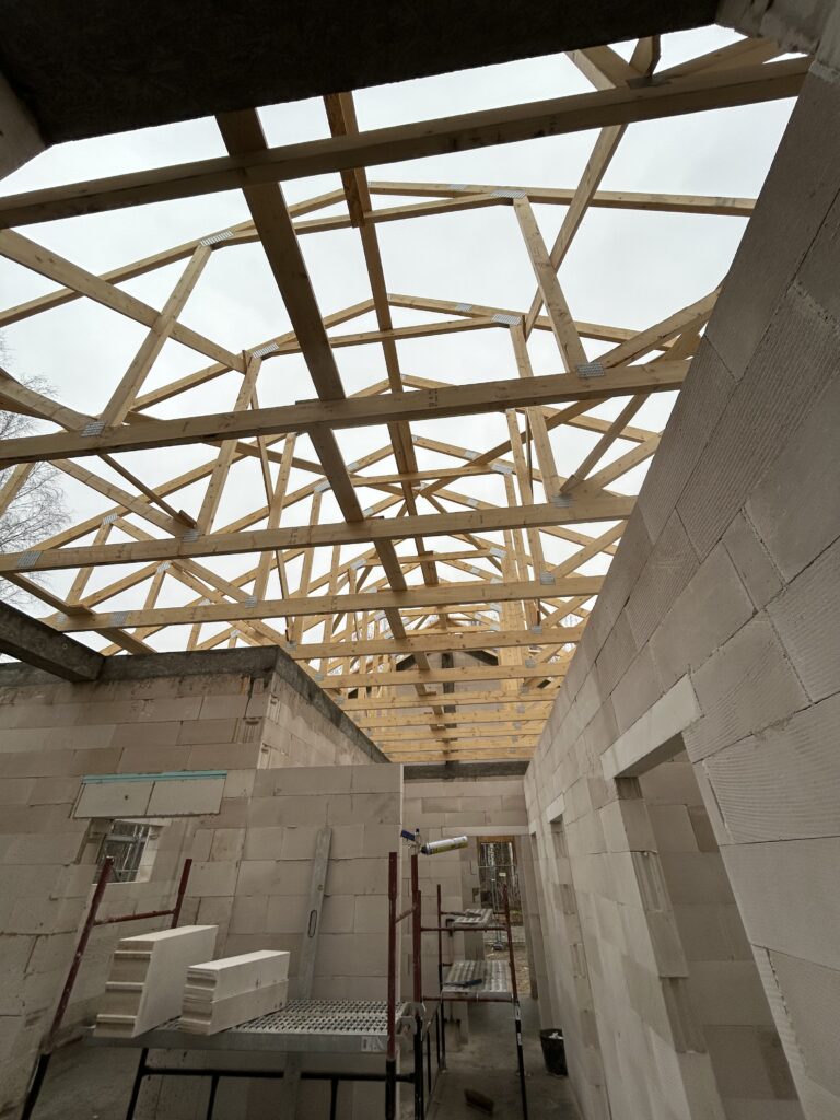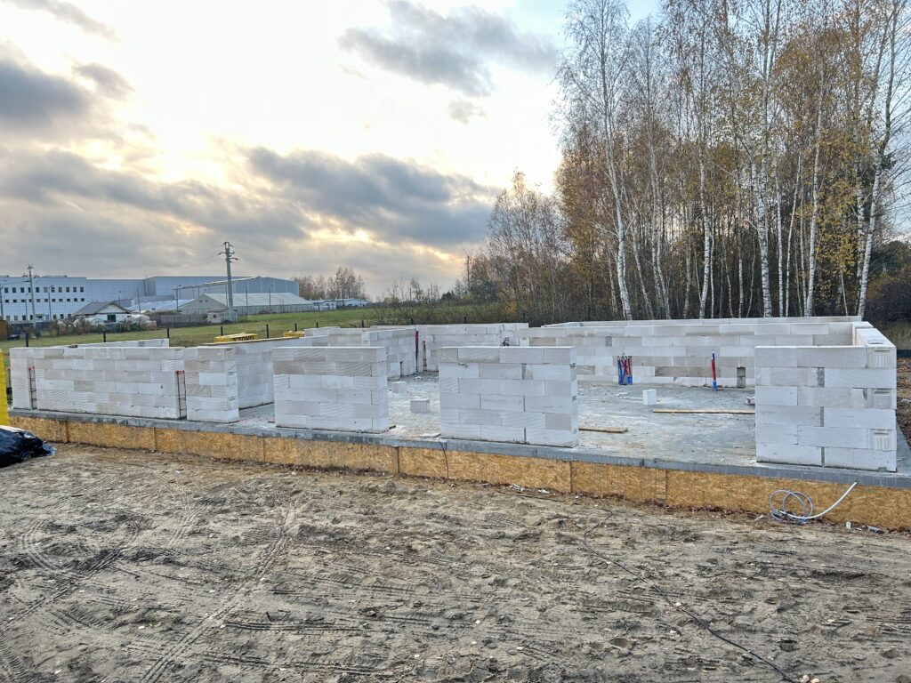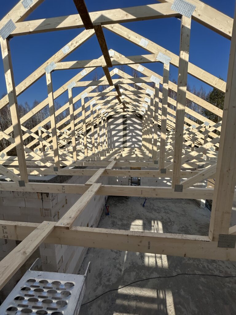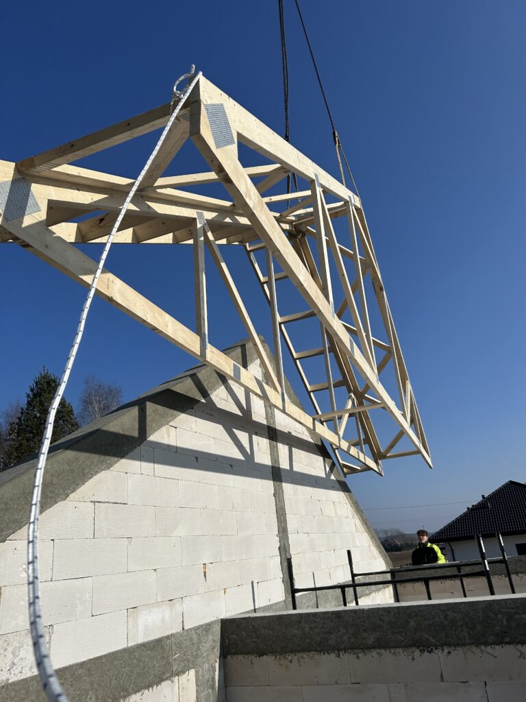 Ciepła płyta fundamentowa, więźba prefabrykowana, realizacja 6 m-cy stan surowy z dachem.