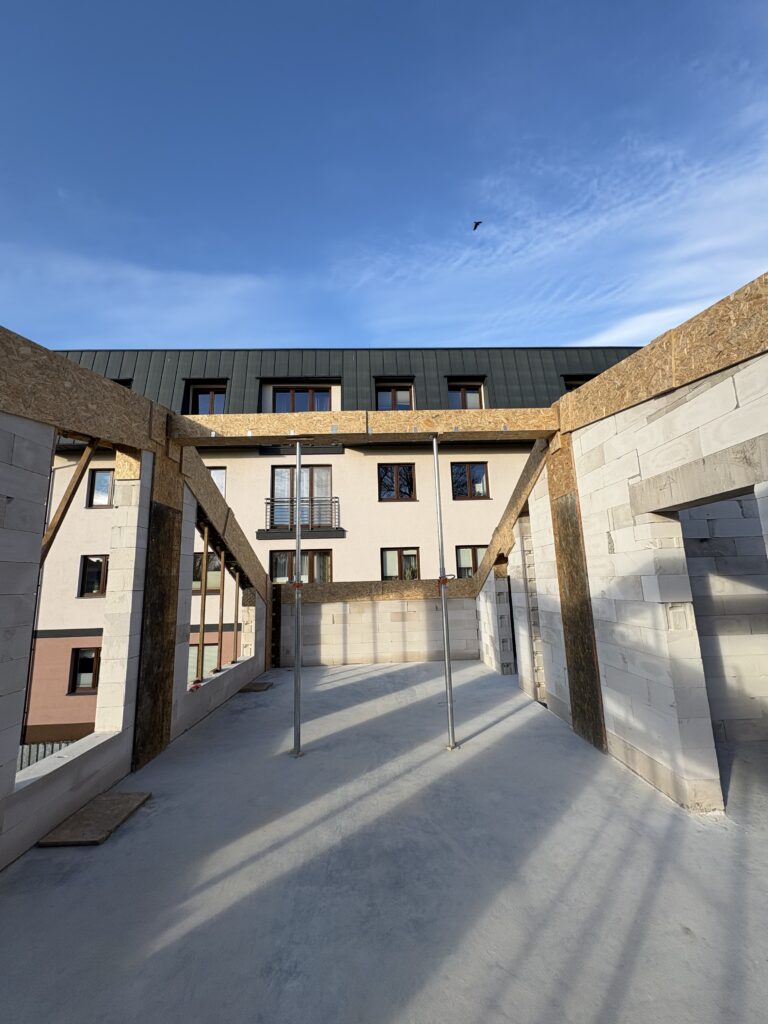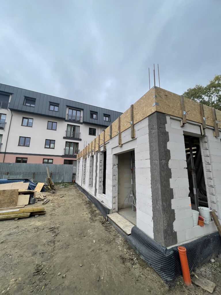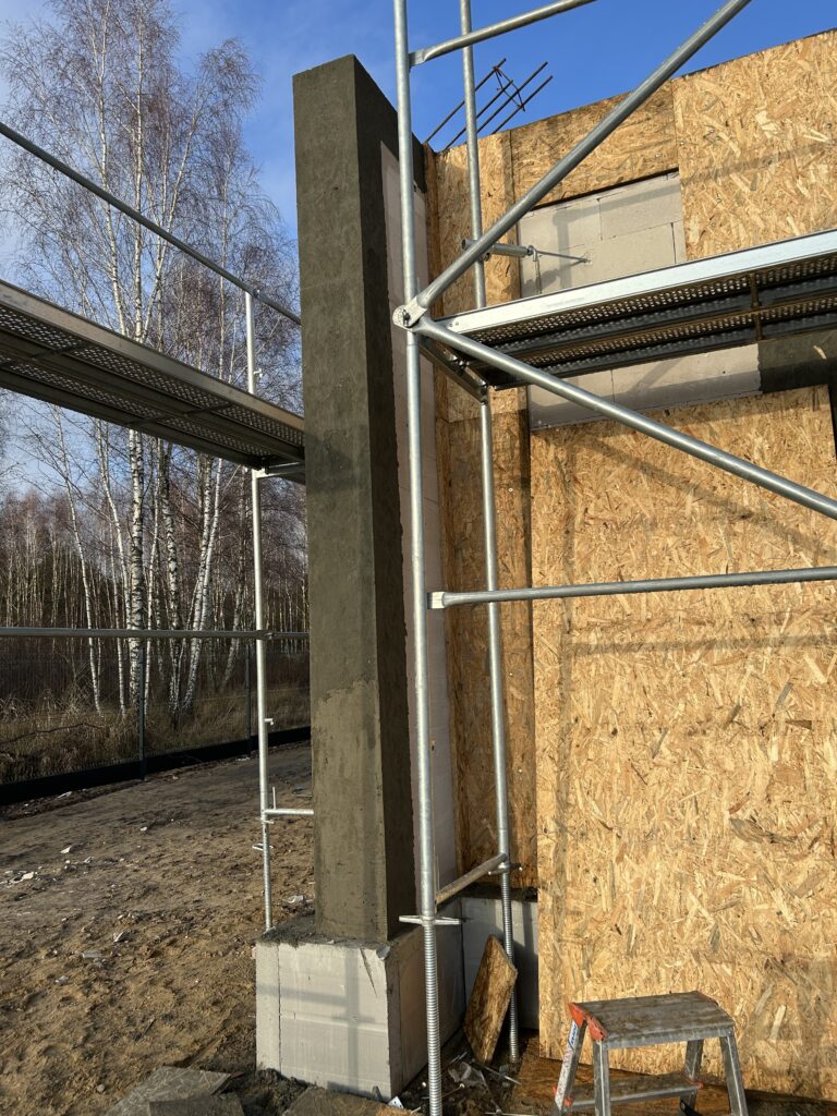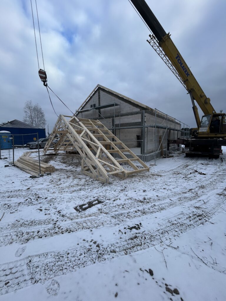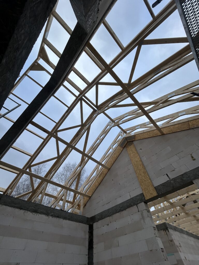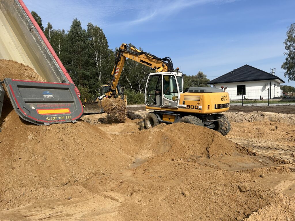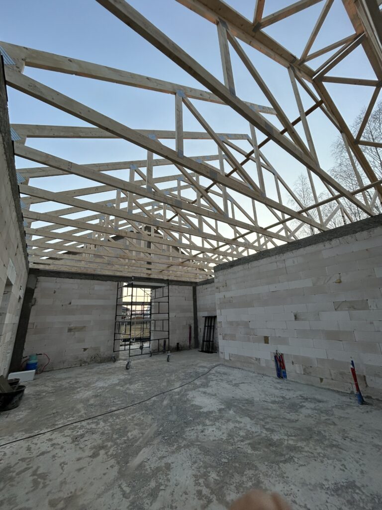 Ciepła płyta fundamentowa, więźba prefabrykowana, realizacja 6 m-cy stan surowy z dachem.
